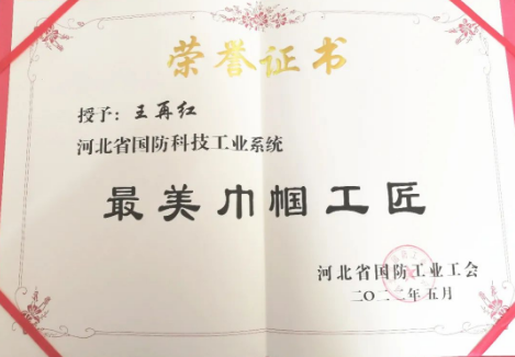 王再紅,中共黨員,正高級工程師,擔任風帆研究院基礎科研室主任。2022年榮獲河北省國防科技工業系統“最美巾幗工匠”榮譽稱號。工作中她充分發揮專業特長,堅守科研一線,用實際行動詮釋著創新與奉獻,彰顯著巾幗工匠風范。
