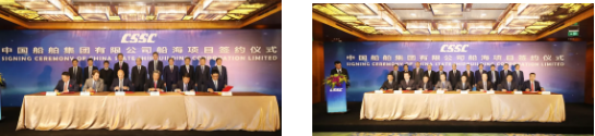 ????主要簽約項目包括:中國船舶集團所屬重慶川東船舶重工有限責任公司與中遠海運(上海)有限公司1.38萬噸不銹鋼化學品船項目;中國船舶集團所屬大連船舶重工集團有限公司與招商輪船VLCC項目;中國船舶集團所屬上海外高橋造船有限公司與工銀租賃21萬噸散貨船項目、外高橋造船與EPS公司20.9萬噸雙燃料散貨船項目;中國船舶集團所屬江南造船(集團)有限責任公司與太平洋氣體公司VLEC項目、江南造船與 SINOGAS86000立方米VLGC項目、江南造船與UECC公司3600車汽車滾裝船項目、江南造船與派格達克公司22000方乙烯船項目;中國船舶集團所屬廣船國際有限公司與斯坦納公司5萬噸甲醇雙燃料油船項目、廣船國際與EPS公司LNG雙燃料蘇伊士油船項目、中國船舶集團所屬滬東中華造船(集團)有限公司與MOL18600立方LNG加注船項目;中國船舶集團所屬武船集團青島北海船舶重工有限責任公司與中國船舶集團所屬中船租賃21萬噸散貨船項目、中國船舶集團所屬中船澄西船舶修造有限公司與國銀租賃85000噸散貨船項目、重慶川東船舶重工與重慶冠達世紀游輪650客游輪項目;中國船舶租賃與 Golar LNG 船舶改裝融資租賃項目、中國船舶租賃與SINOGAS86000立方米VLGC融資租賃項目;中船租賃與山東海運21萬噸散貨船融資租賃項目、中船租賃與Navig 8 成品油船聯合投資協議、中船租賃與新加坡星展銀行VLCC融資協議。