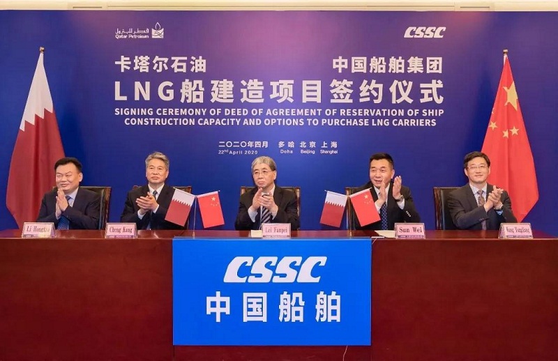 ????4月22日,中國船舶集團(tuán)與卡塔爾石油公司在中國北京、上海及卡塔爾多哈三地以“云簽約”方式聯(lián)合簽署“中國船舶—卡塔爾石油液化天然氣(LNG)船建造項(xiàng)目”協(xié)議,所涉訂單總金額超過200億元人民幣。這是卡塔爾天然氣項(xiàng)目首批訂單,也是中國船企迄今承接的金額最大的造船出口訂單。中國船舶集團(tuán)和卡塔爾石油將強(qiáng)強(qiáng)聯(lián)手,依托各自優(yōu)勢在能源運(yùn)輸、裝備制造及全球化服務(wù)等領(lǐng)域開展廣泛合作。