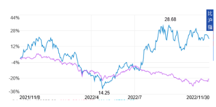 很顯然,中船系憑其創新和產業鏈優勢已成為中國資本市場一股新生力量。中國船舶集團龍頭股中國船舶(600150)2022年11月30日收盤價比去年同期上漲約20%,跑贏大市。下圖為2022年11月30日中國船舶與滬深300指數漲跌對比圖,上部曲線為中國船舶,下部曲線為滬深300。