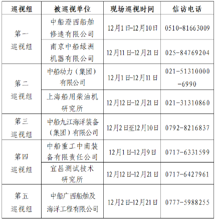 根據(jù)中國船舶集團(tuán)黨組2022年第二輪巡視工作部署,截至2022年12月2日,中國船舶集團(tuán)黨組5個巡視組已進(jìn)駐中船澄西船舶修造有限公司、中船動力(集團(tuán))有限公司、中船九江海洋裝備(集團(tuán))有限公司、中船重工中南裝備有限責(zé)任公司、中船廣西船舶及海洋工程有限公司等單位,開展為期20天左右的巡視“回頭看”。巡視期間,巡視組設(shè)置專門值班電話(具體如下表),同時(shí)在巡視組工作現(xiàn)場設(shè)置聯(lián)系信箱,廣大干部職工可以反映情況。